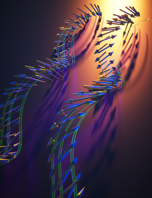 An artistic impression of the light pulse that locally shakes the spins in the antiferromagnet, which results in spin waves propagating into the material.